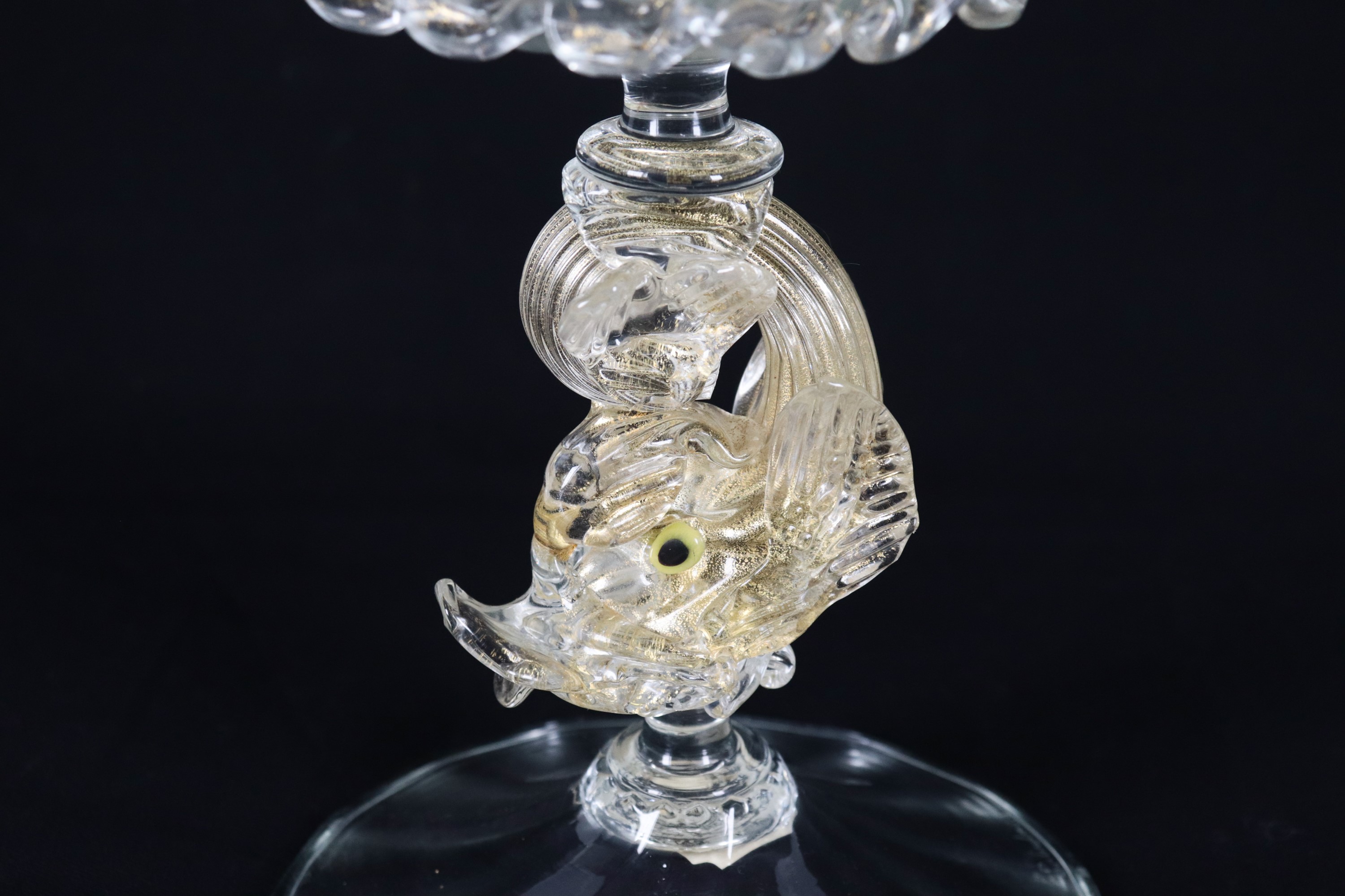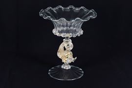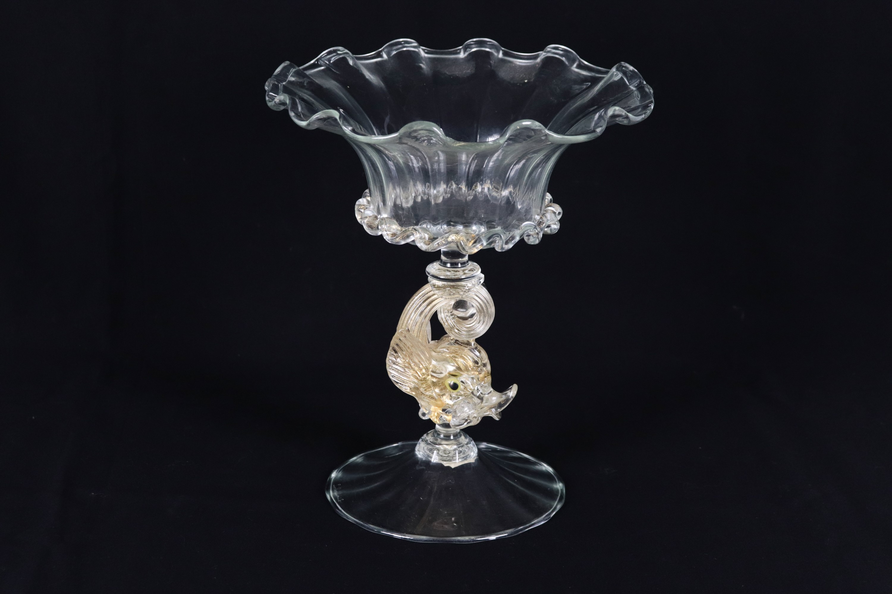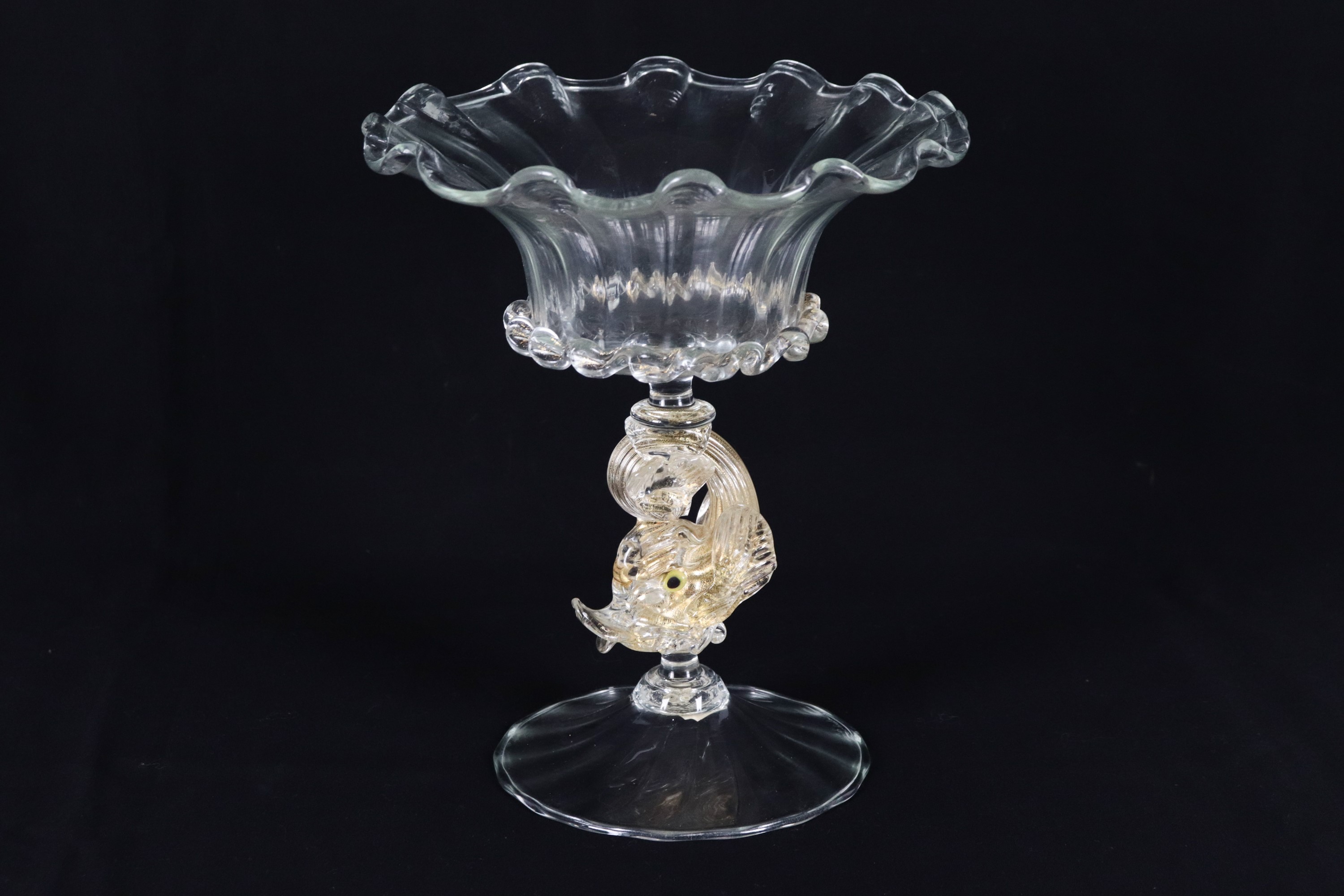 Piccolo vaso a calice in vetro soffiato di Murano, sorretto da piccola scultura di delfino