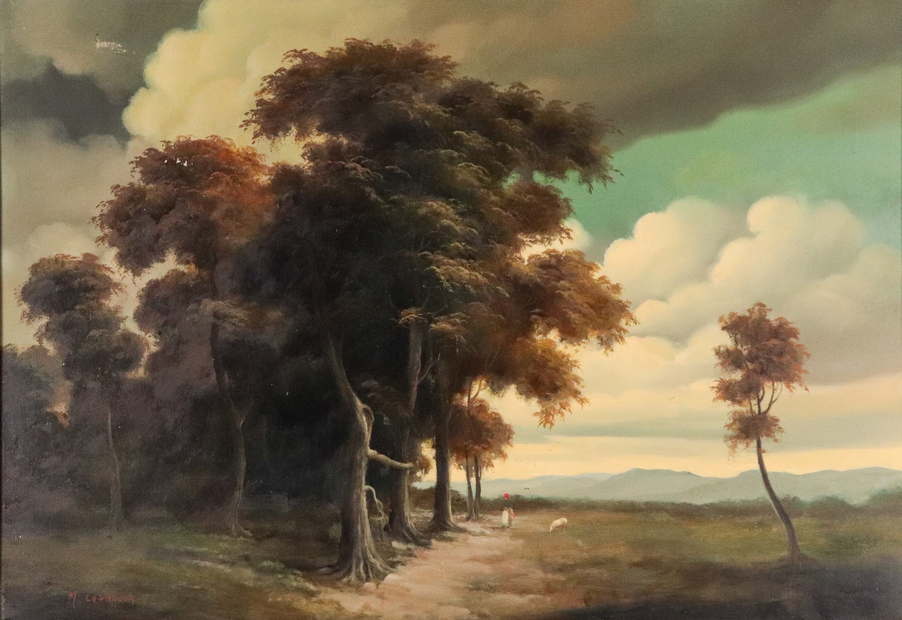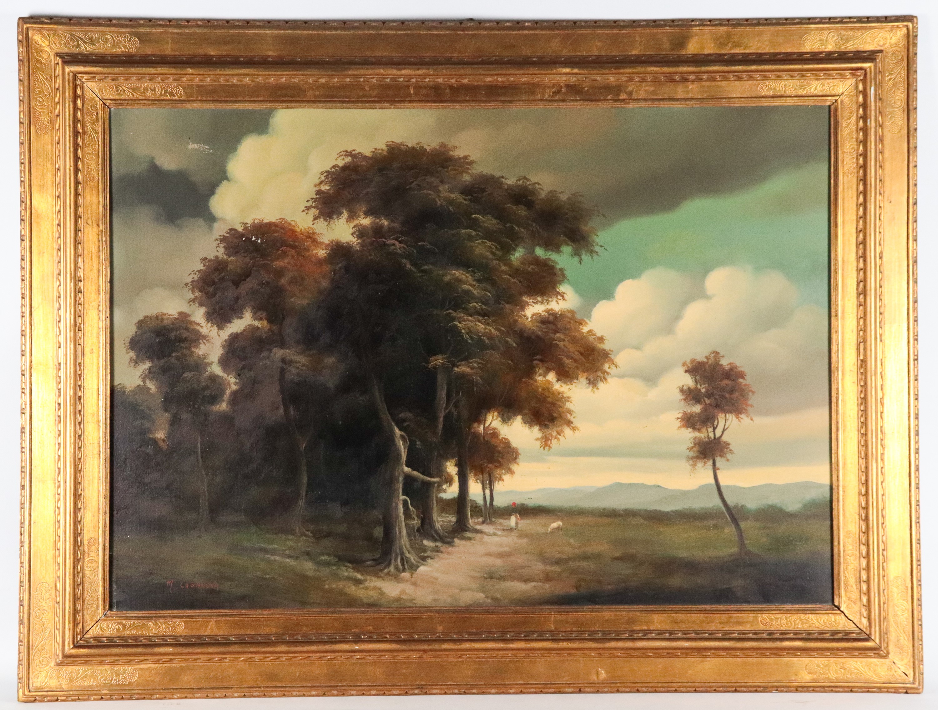 Firmato. "Paesaggio boschivo con contadina e pecorella"