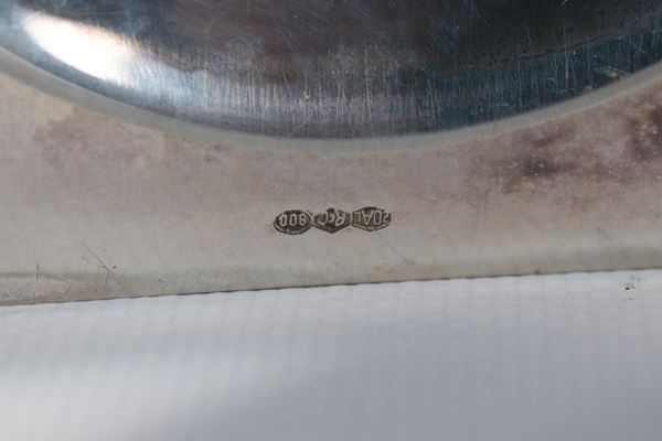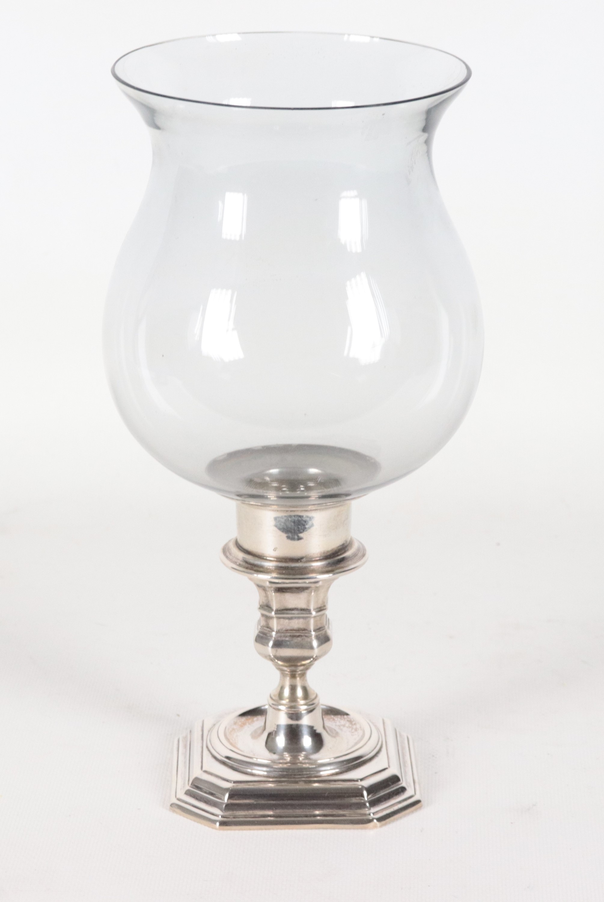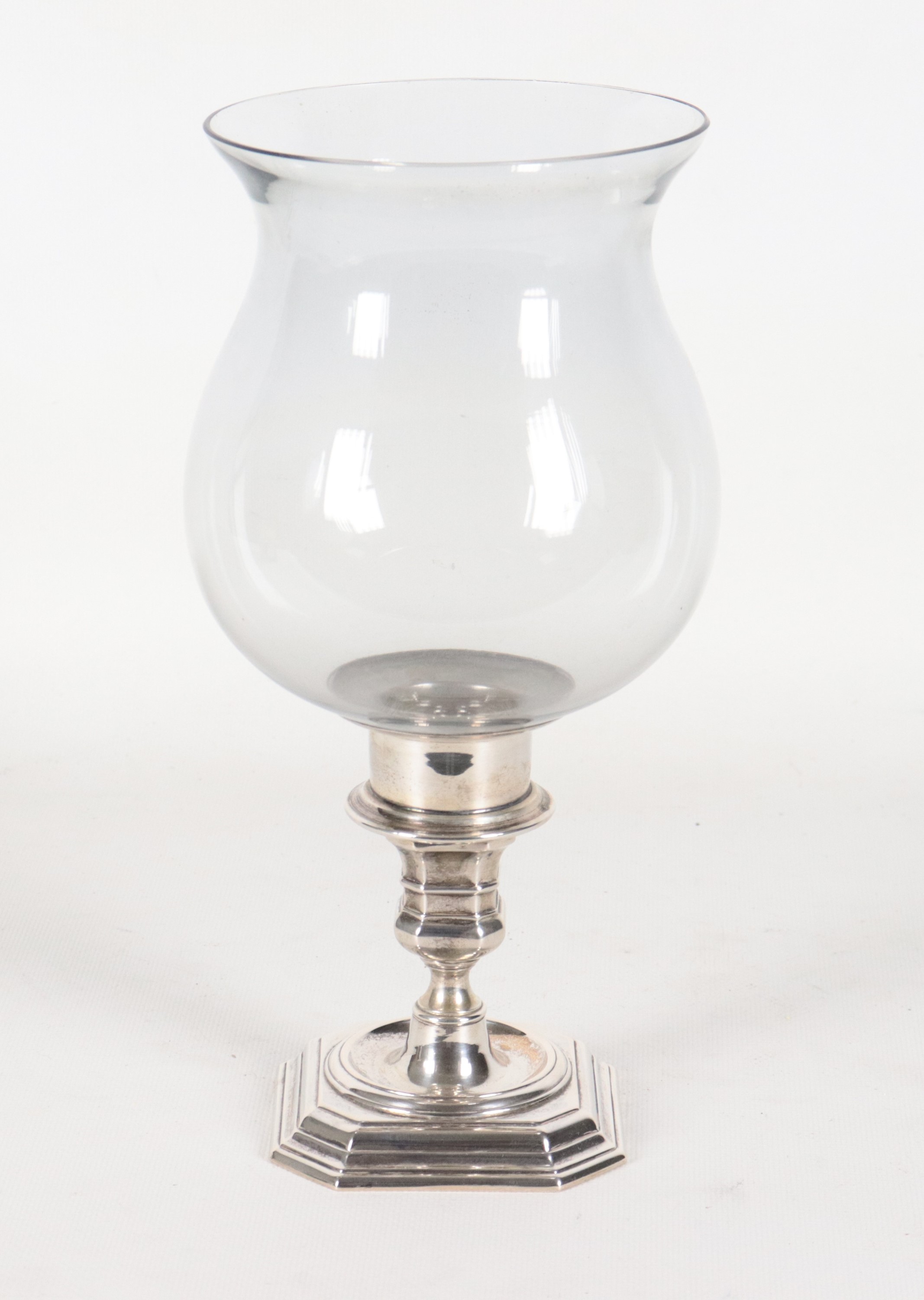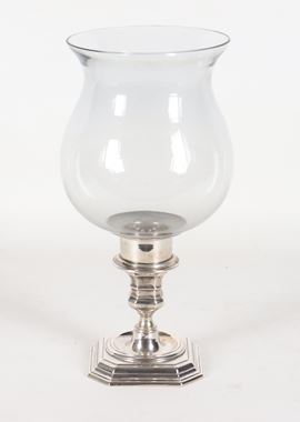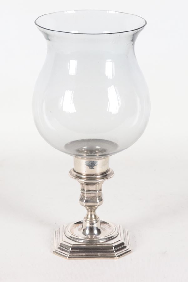 Portacandela in argento cesellato con campana in vetro soffiato. Peso netto gr. 170