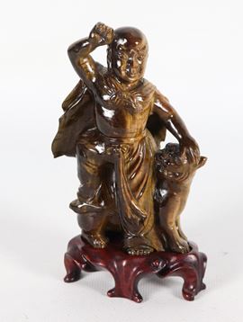 "Santone con cane foo", statuina cinese in occhio di tigre con basetta in teak