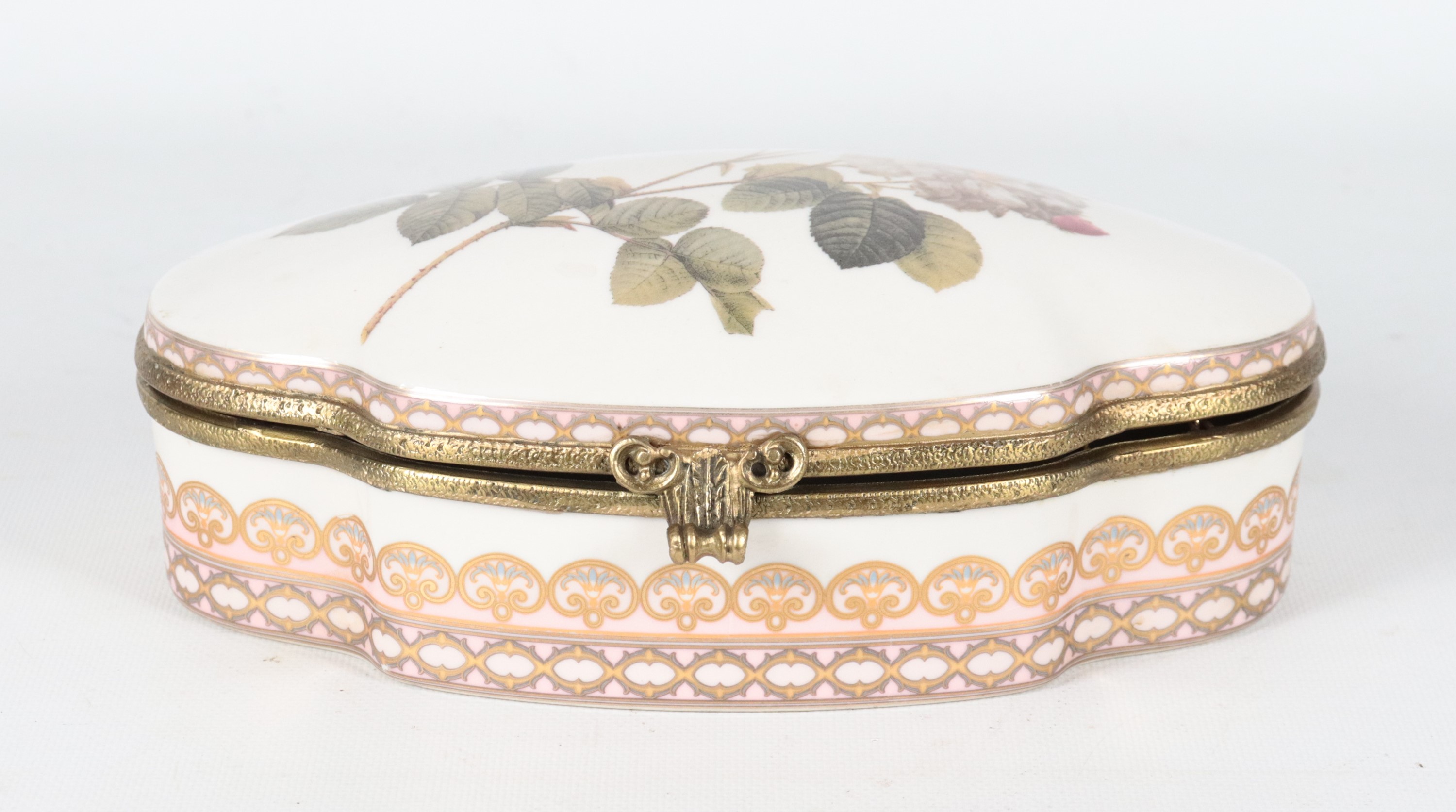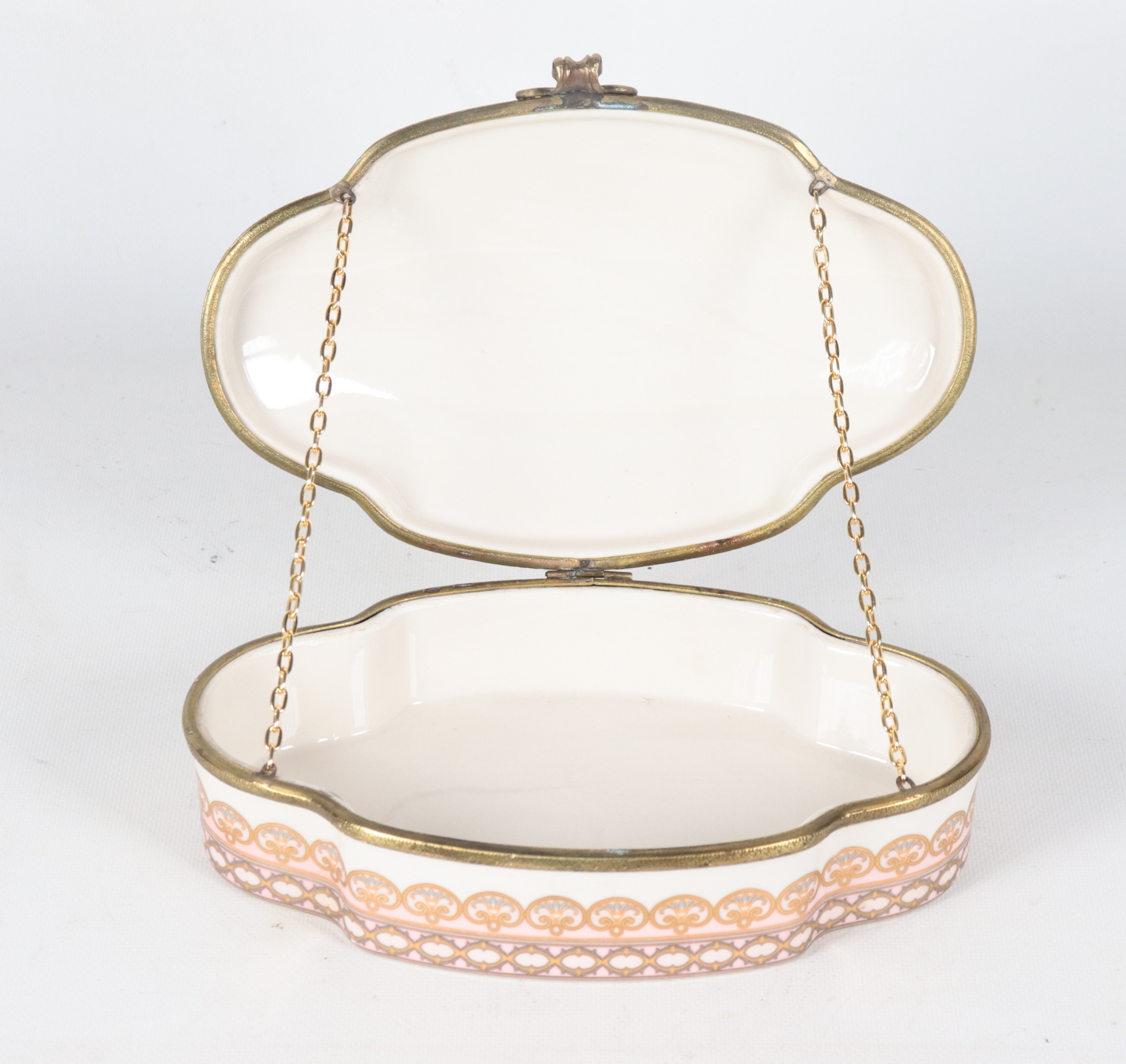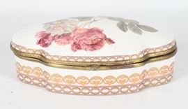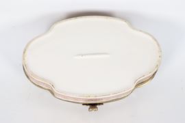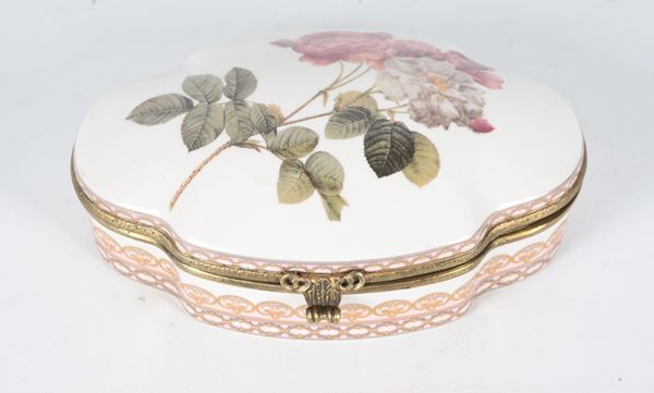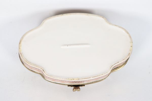 Scatola ovale sagomata in porcellana smaltata, con decorazioni policrome floreali sul coperchio