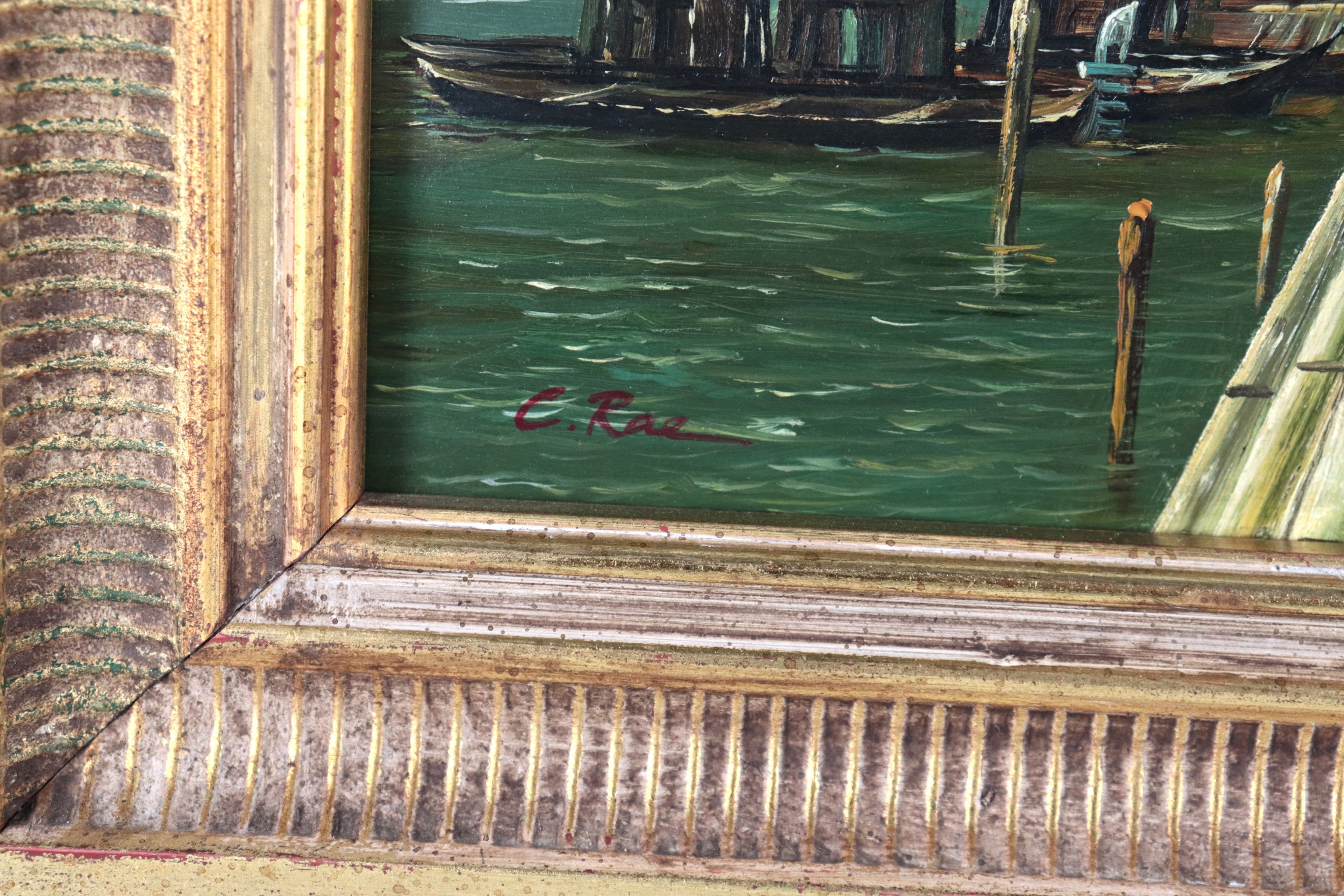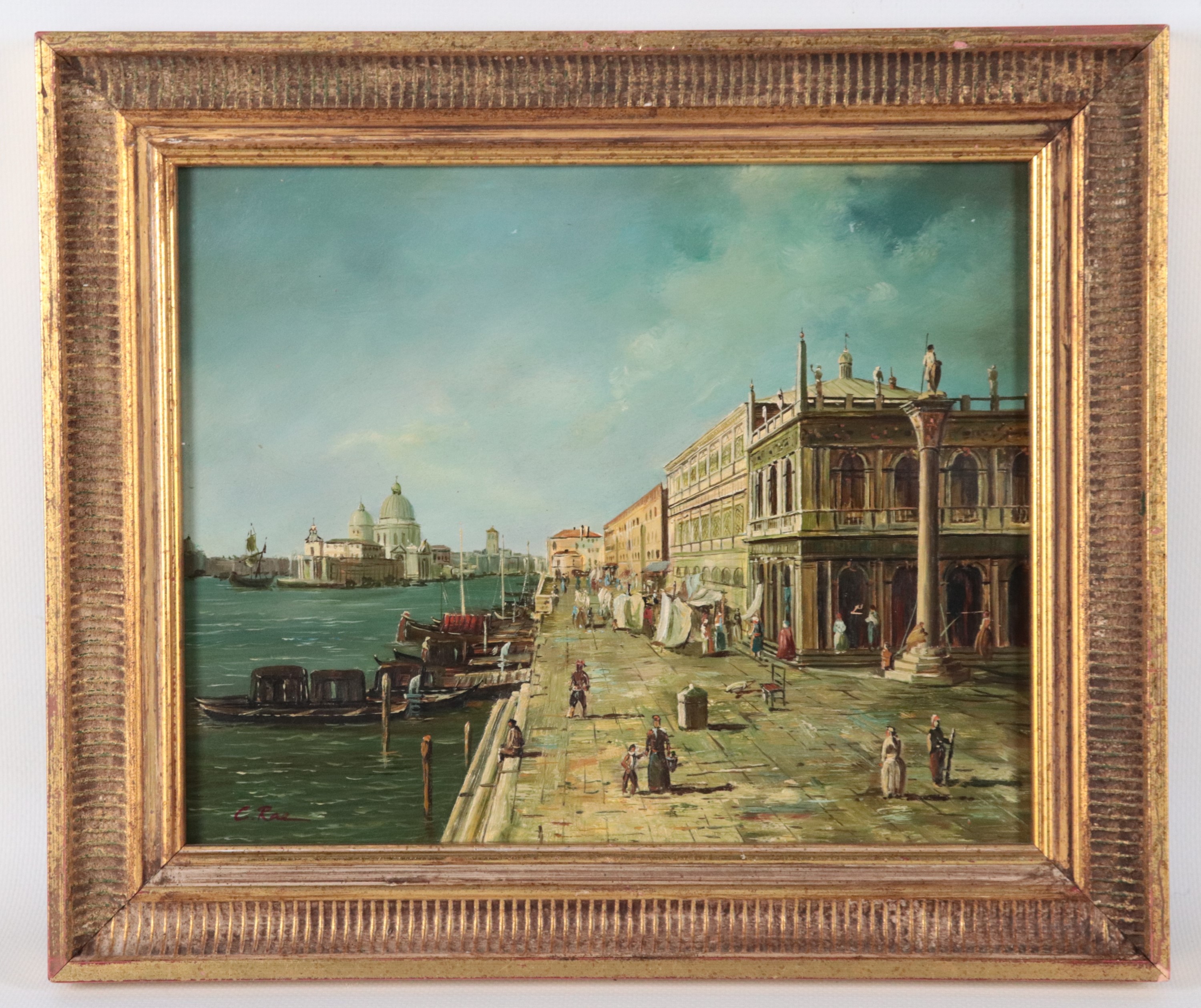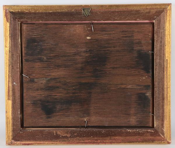 piccolo dipinto ad olio su tavolettacornice in legno dorato e intagliato, cm 20 x 25.