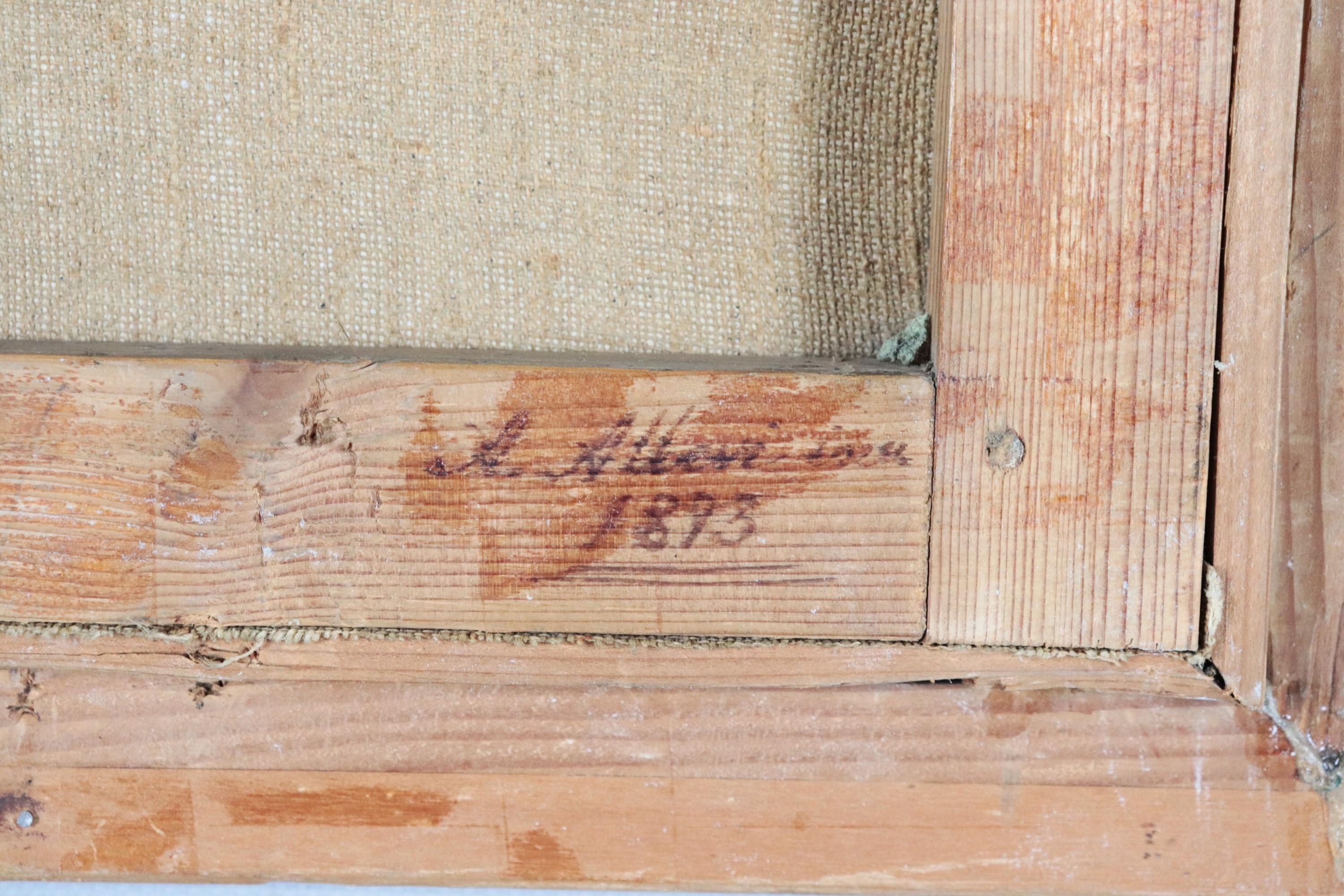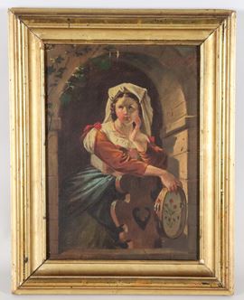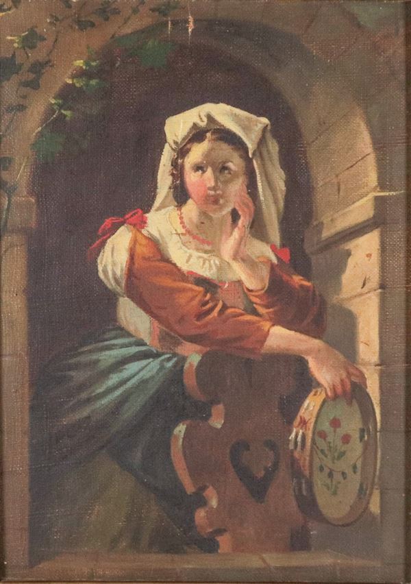 "Popolana in costume con tamburello e sgabello". Firmato e datato 1873 su un angolo del telaio