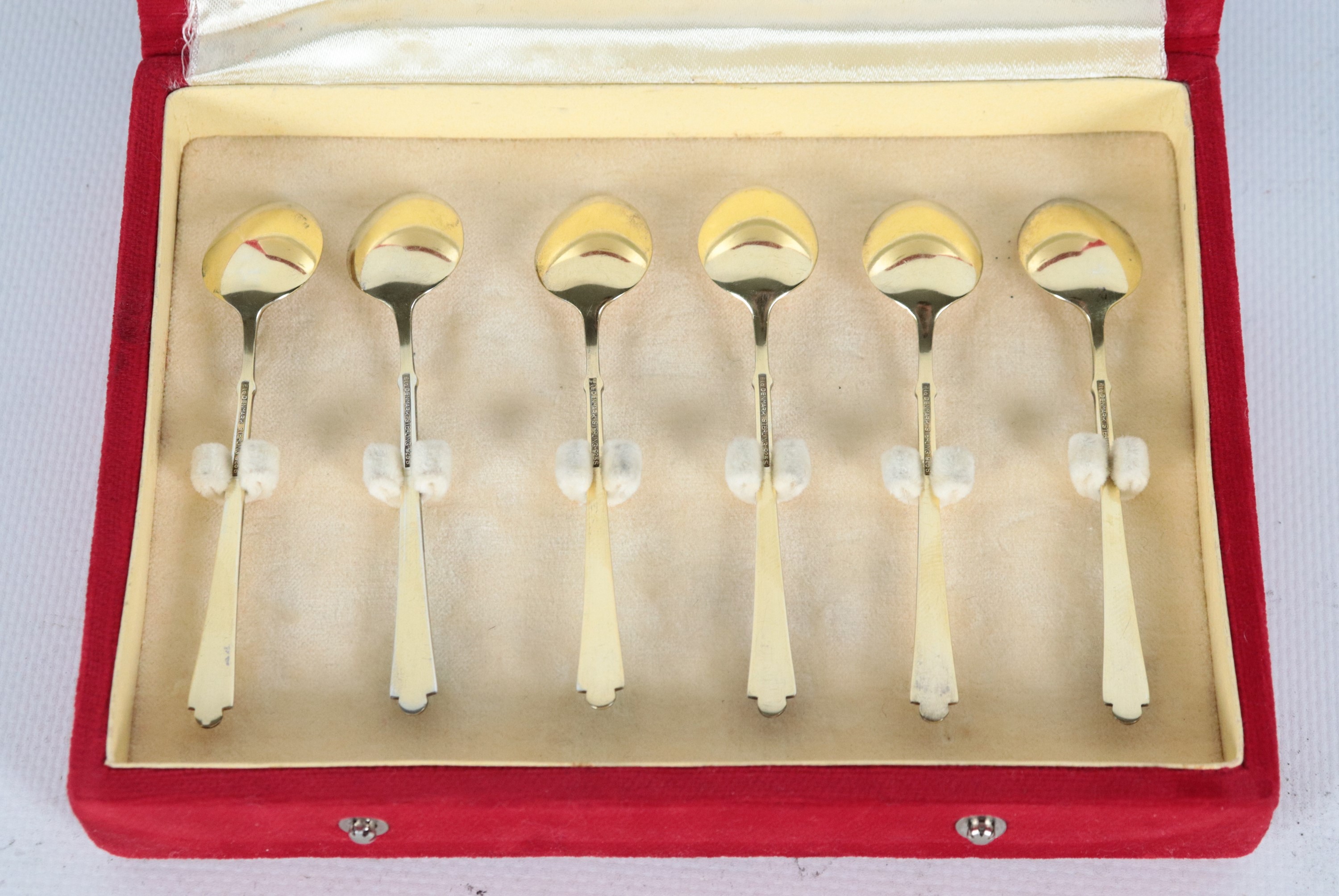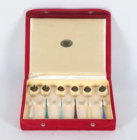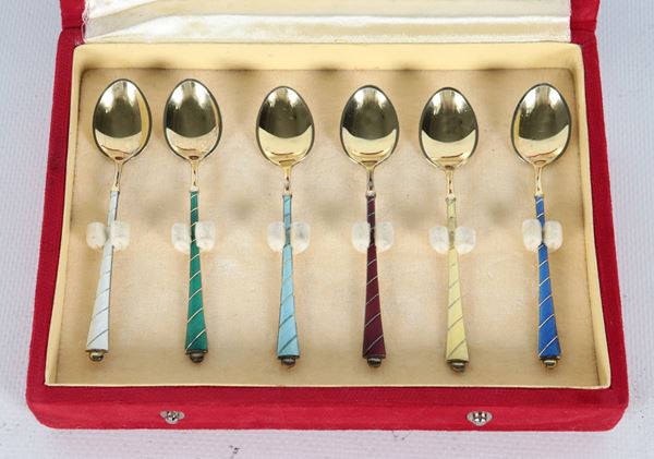 Set di sei cucchiaini in argento vermeil sterling 925, con manici rivestiti in smalti policromi, gr. 45