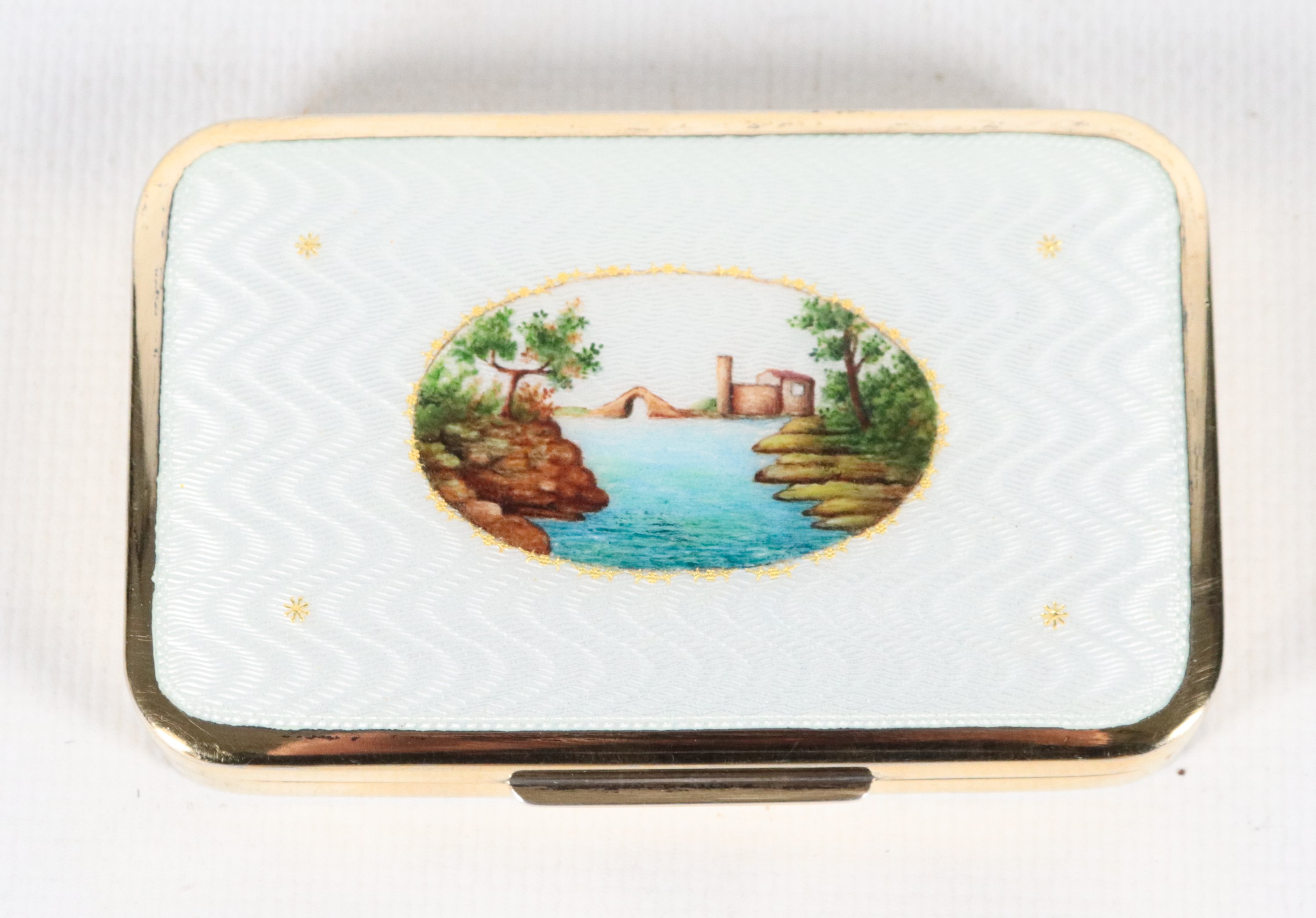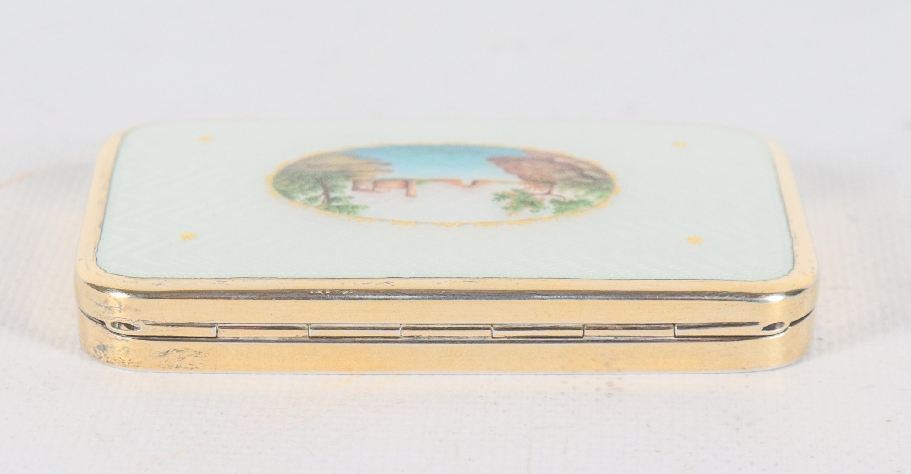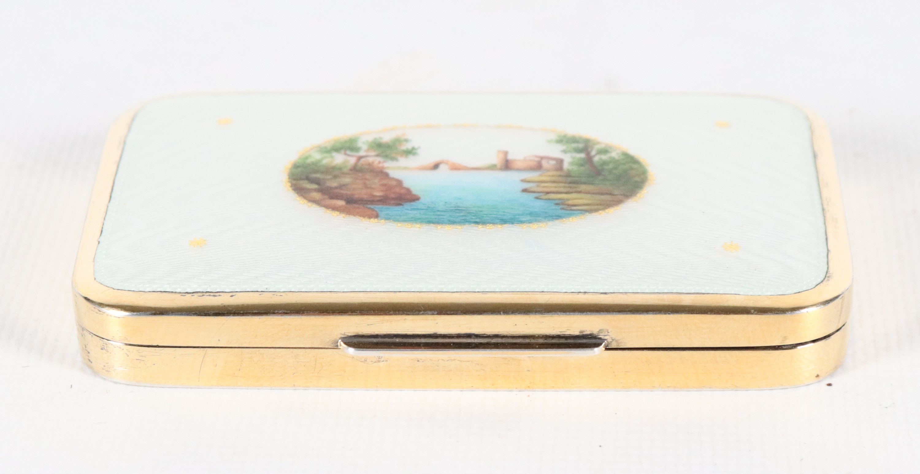 Tabacchiera in argento vermeil titolo 925, con coperchio rivestito in smalto bianco e miniatura ovale al centro, peso lordo gr. 130
