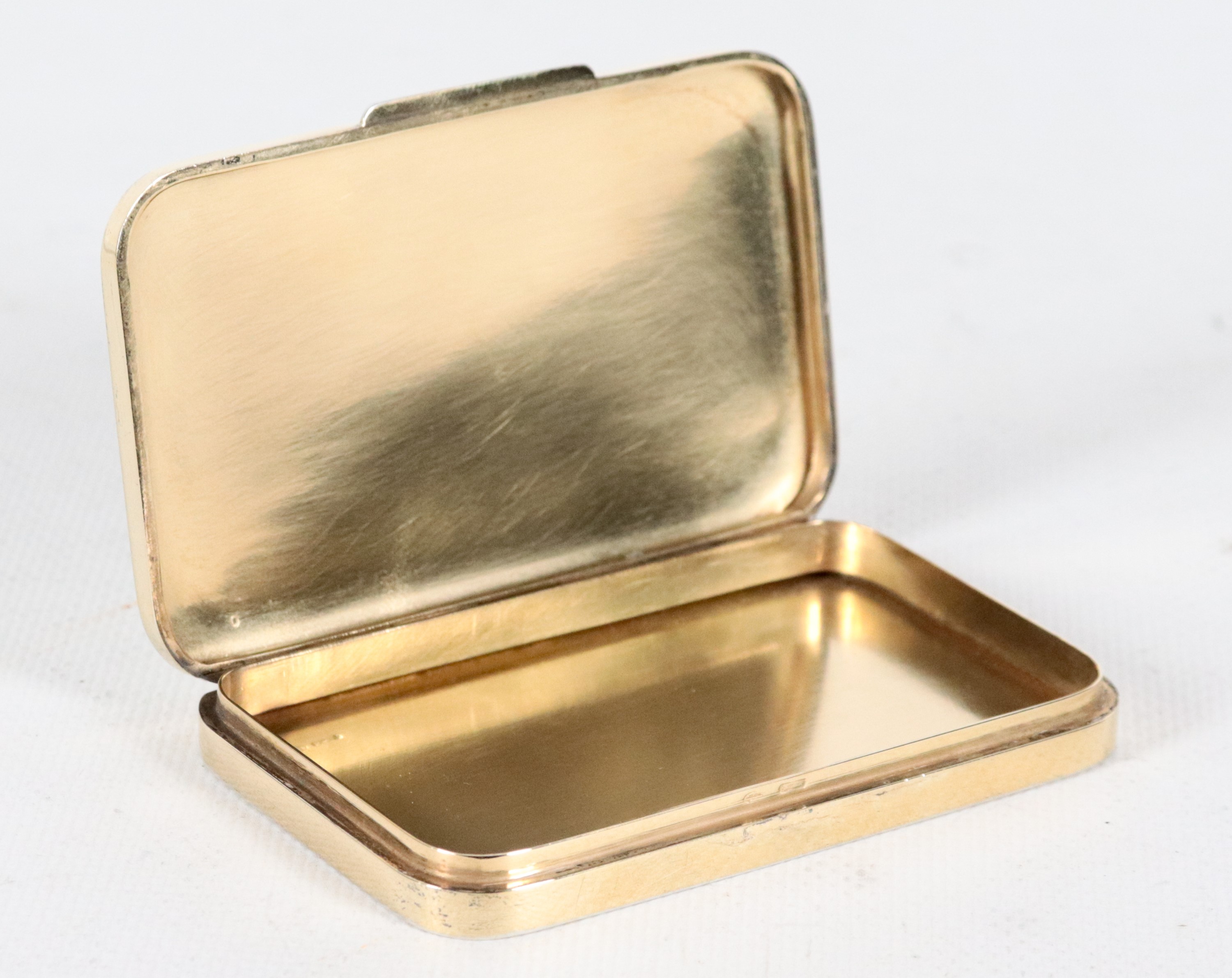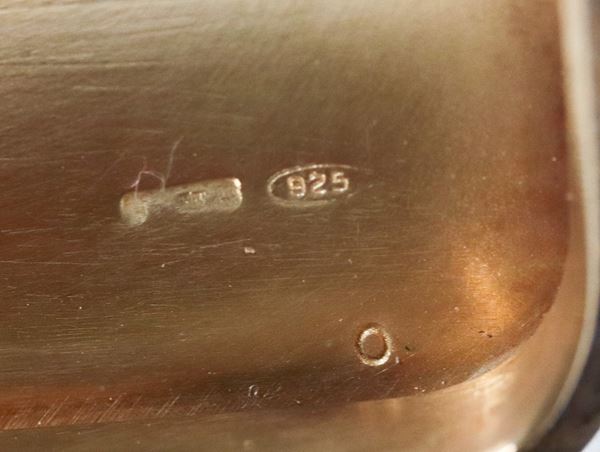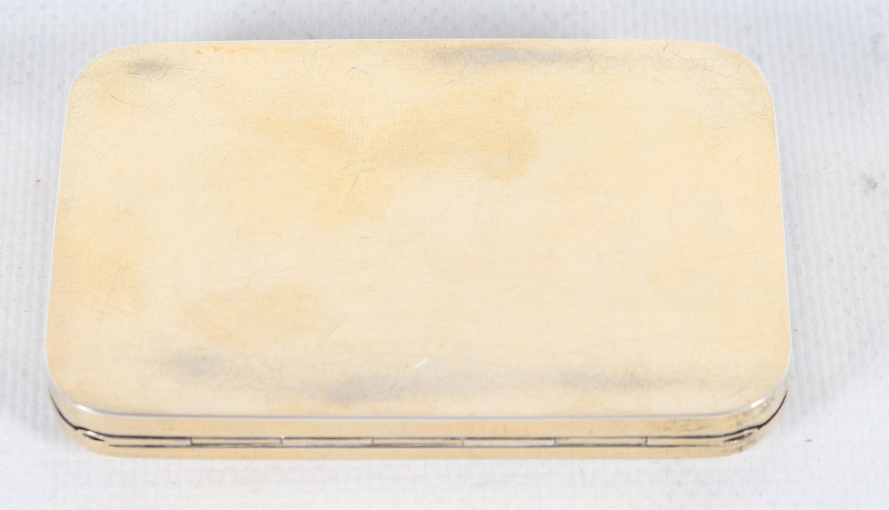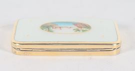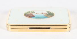 Tabacchiera in argento vermeil titolo 925, con coperchio rivestito in smalto bianco e miniatura ovale al centro, peso lordo gr. 130