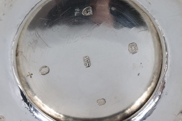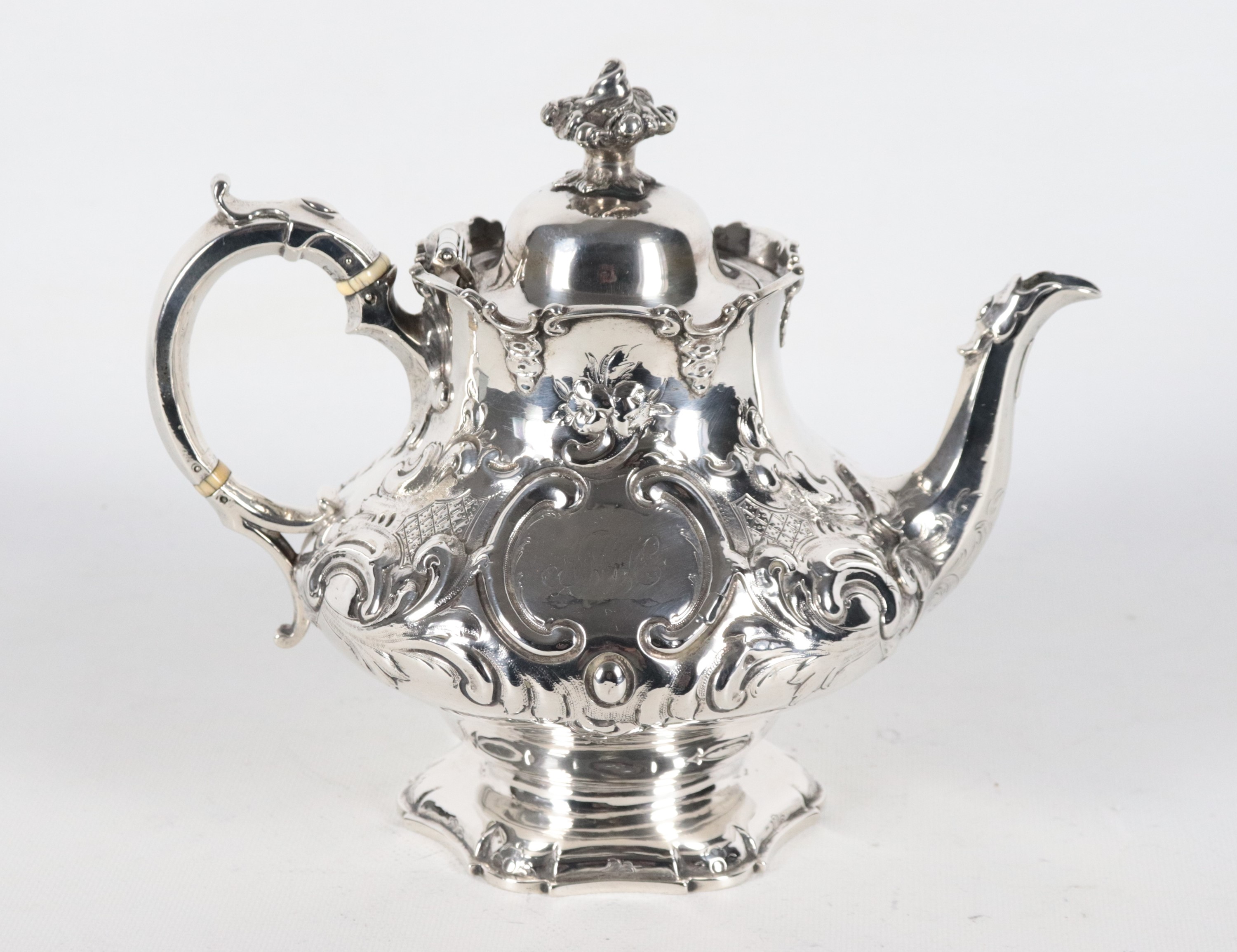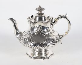 Teiera in argento Epoca Regina Vittoria, interamente cesellata e sbalzata a volute di foglie d'acanto e monogramma inciso, gr. 790