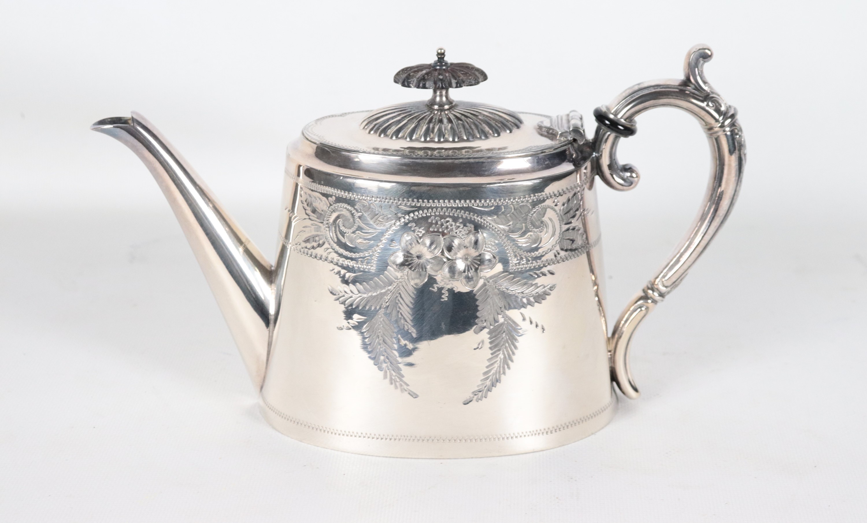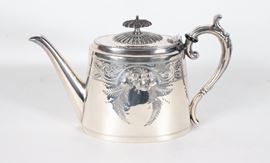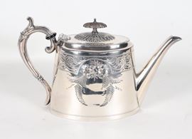 Teiera in sheffield cesellato e sbalzato a motivi di intrecci floreali