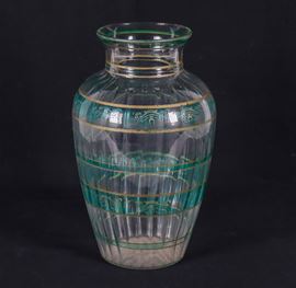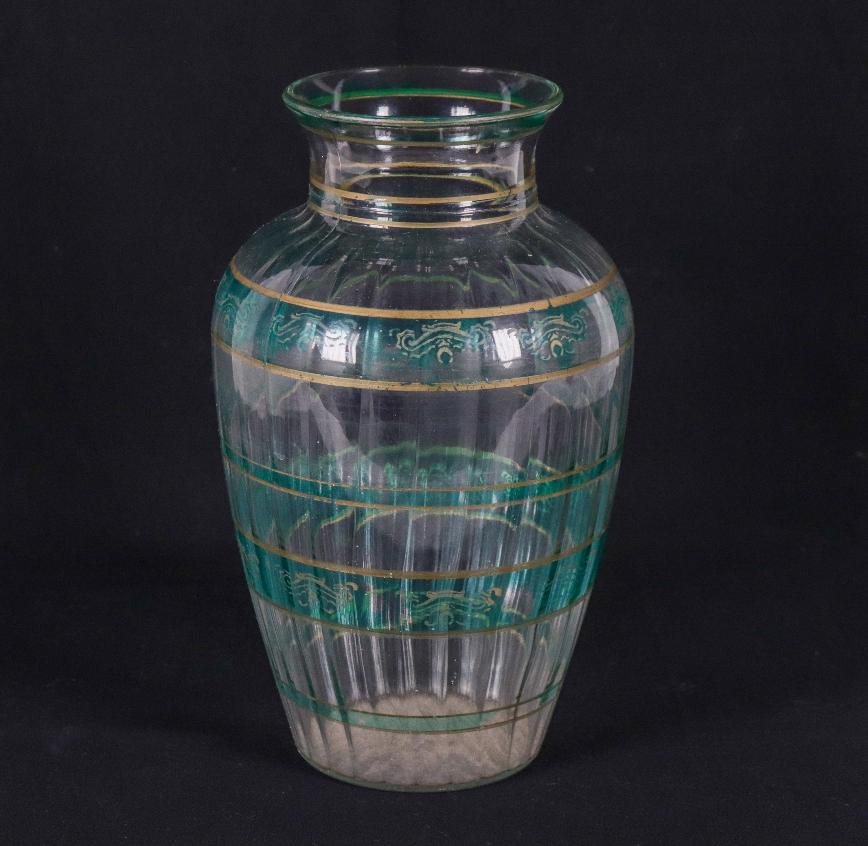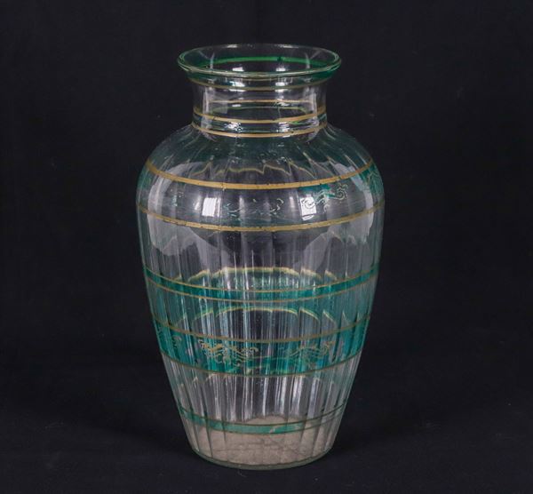 Vaso in vetro soffiato di Murano, con decorazioni in oro e fasce verde smeraldo