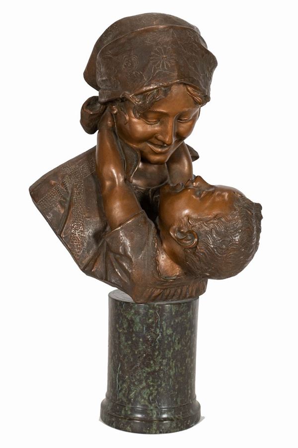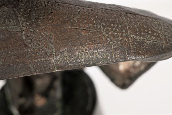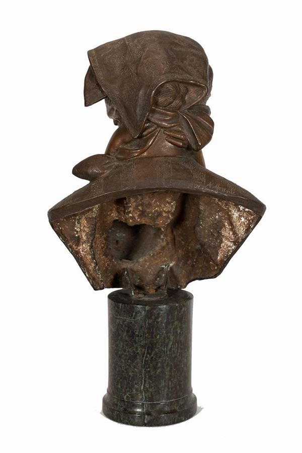 scultura in bronzo su base a mezza colonna in marmo verde delle Alpi. Altezza cm. 76.