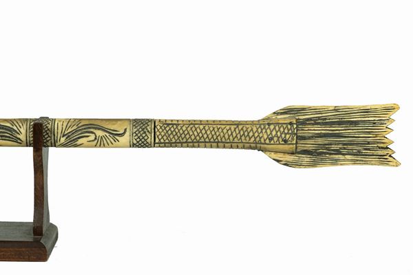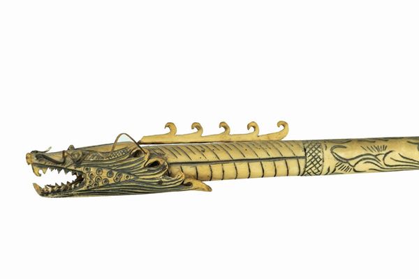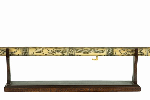 in osso lavorato a forma di serpente acquatico, basetta in legno. Lunghezza cm. 128.