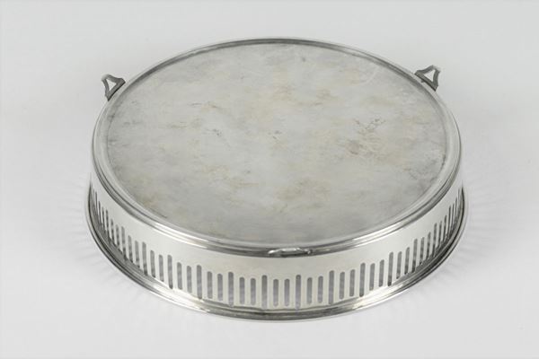 con bordo a ringhierina traforata, sorretto da tre piedini ricurvi. Peso gr. 320. Diametro cm. 23.