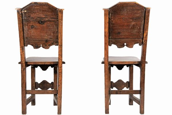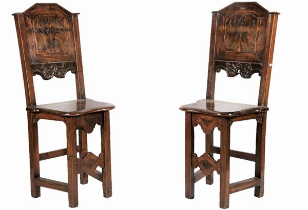 in noce con schienali alti intarsiati ed intagliati. Misura cm. 45 x 38 x 110 h.