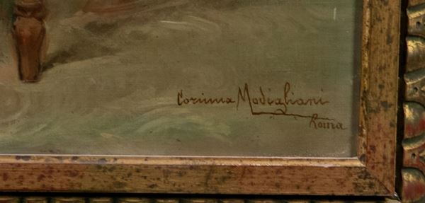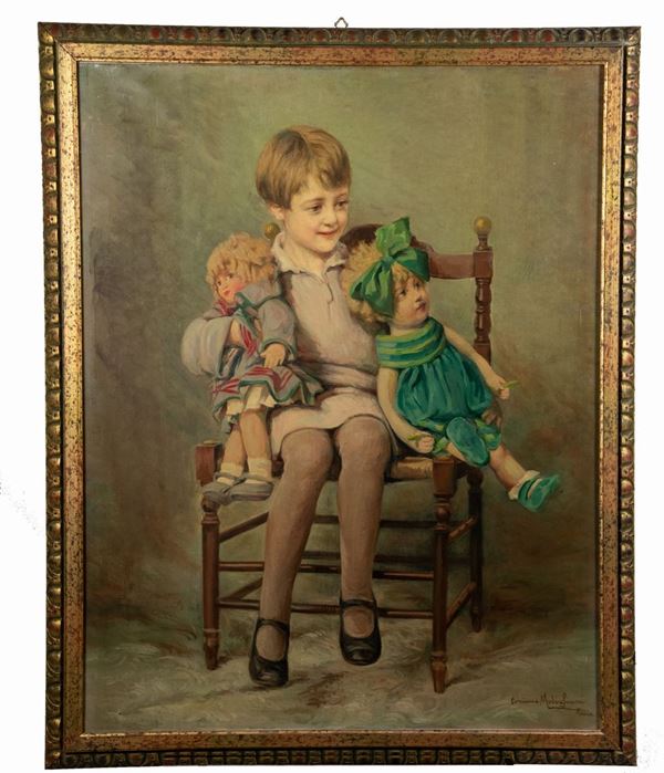 dipinto ad olio su tela opera dell'Artista Romana che, pur coltivando sia il paesaggio che la natura morta, privilegiò in particolare il genere del ritratto ed i soggetti legati all'infanzia, con opere ad olio o a pastello caratterizzate da una tecnica vivace e una tavolozza di sperimentata abilità. I suoi dipinti erano destinati soprattutto alla committenza privata. Sue opere sono conservate nella Galleria Comunale d'Arte Moderna e Contemporanea di Roma. Cornice in legno dorato. Misura cm. 98 x 76.