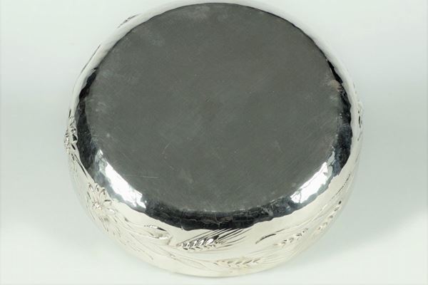con bordo interamente cesellato e sbalzato a motivi di spighe di grano. Peso gr. 430. Diametro cm. 22.