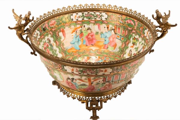 decorata e smaltata a rilievo con scene di vita e fiori orientali, bordo con manici e base in bronzo dorato. Diametro cm. 37 x 23 h.