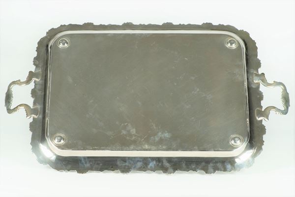 a forma rettangolare con bordi e manici cesellati e sbalzati a tralci e grappoli d'uva. Misura cm. 70 x 42.