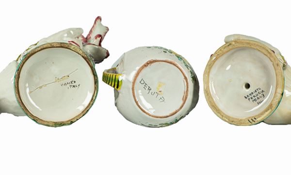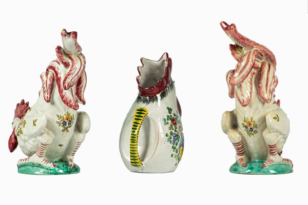 smaltata e porcellanata con decorazioni a motivi floreali, composto da una coppia di galli ed una brocchetta a forma di gallo. Tot. 3 pz. Altezza massima cm. 27.