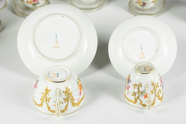 di dieci tazzine da caffè con piattini ed una tazza da tè con piattino interamente decorate e variopinte a motivi di mazzetti di fiori e ghirlande dorate, lumeggiature in oro zecchino. Tot. 11 pz.