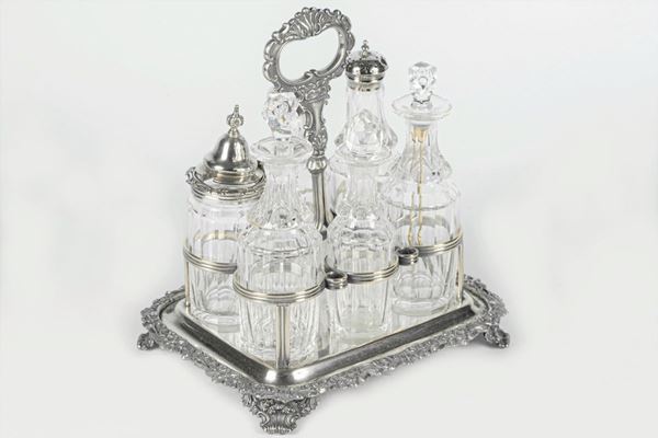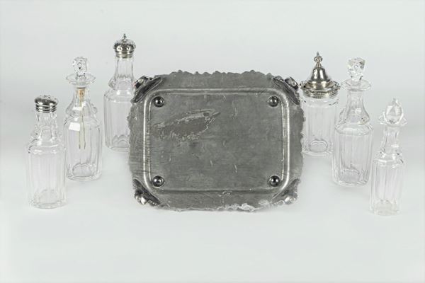 in sheffield con tre ampolle e tre flaconi. Misura cm. 20 x 17 x 23 h.