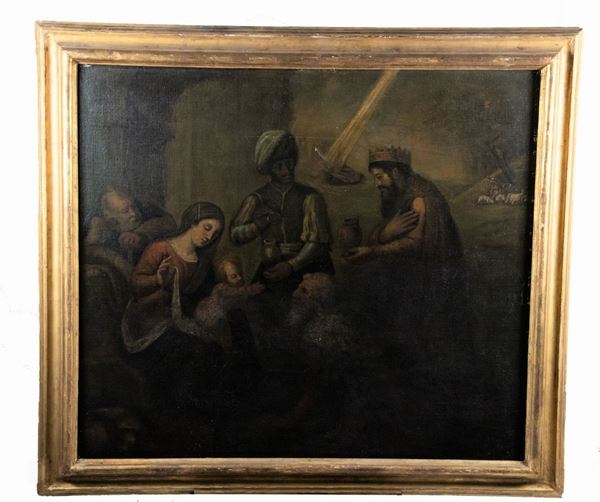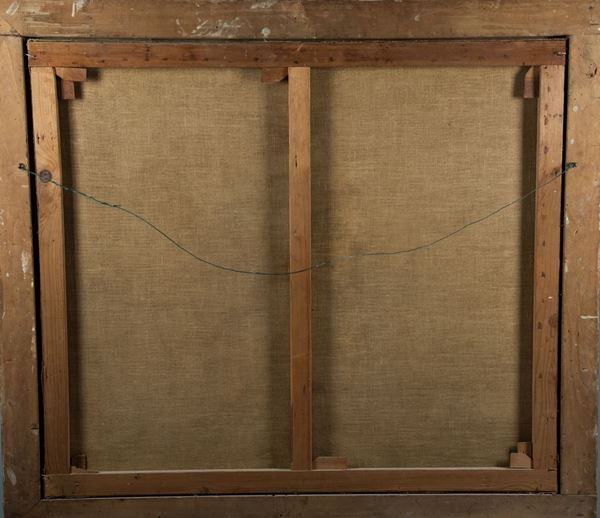 dipinto ad olio su tela in antica cornice in legno dorato. Misura cm. 95 x 110.