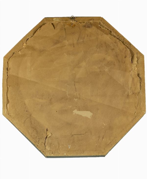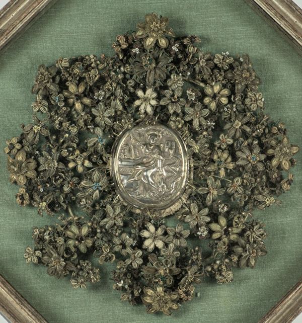 interamente cesellata e sbalzata, contornata di fiori in argento filigranato. Cornice ottagonale a bacheca in legno argentato a mecca. Misura della cornice cm. 47 x 47.