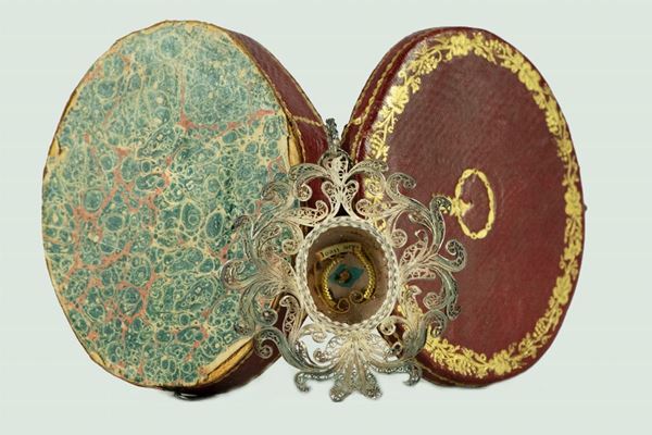 filigranato e cesellato, astuccio in cuoio. Misura cm. 7 x 8 h.