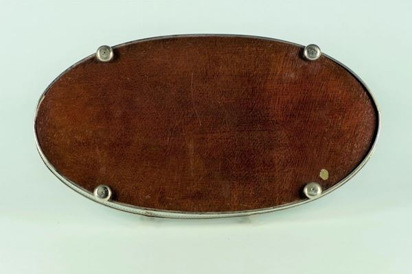 a forma ovale, con bordo cesellato e sbalzato a motivi di ringhierina, fondo a specchio. Misura cm. 24,5 x 45.