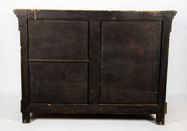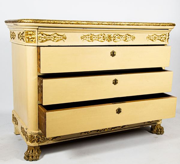 con fregi neoclassici dorati ed intagliati, quattro tiretti e gambe a zampa leonina. Misura cm. 119 x 56,5 x 90 h.