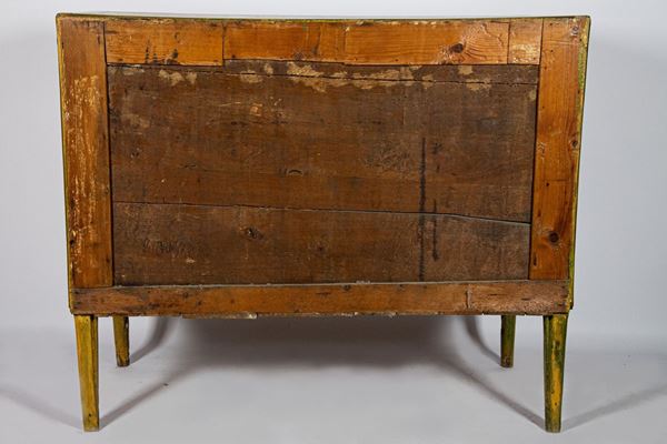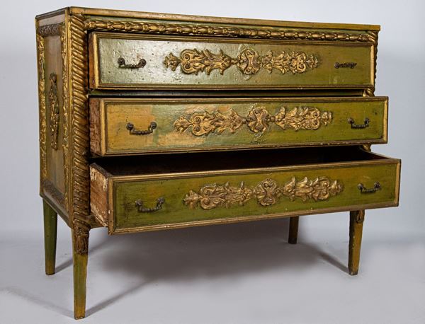 con fregi e cordoni in legno dorato, 3 tiretti e gambe a tronco di piramide. Misura cm. 116 x 51 x 94 h.