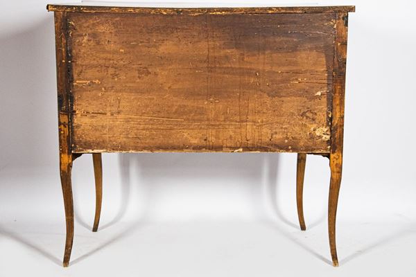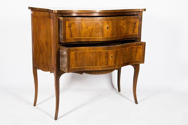 a forma centinata con intarsi a filettature in bosso, due tiretti e gambe ricurve. Misura cm. 88,5 x 40 x 79 h.