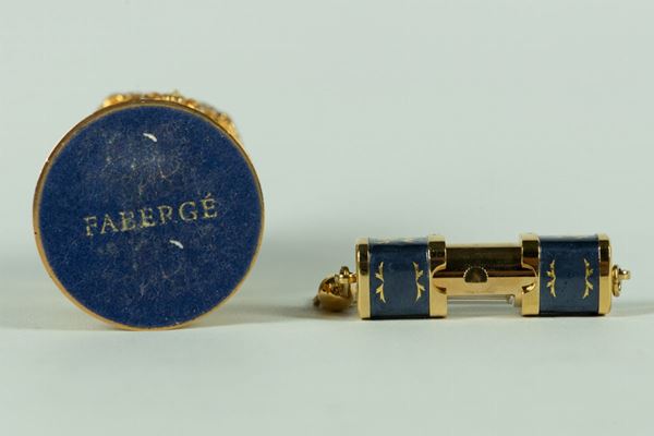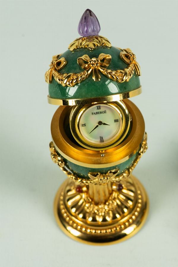 uno a forma di uovo in smalto verde riproduzione Fabergé e uno a ciondolo Bucherer in smalto blu, guarnizioni in metallo dorato. Da revisionare. Altezza massima cm. 9.