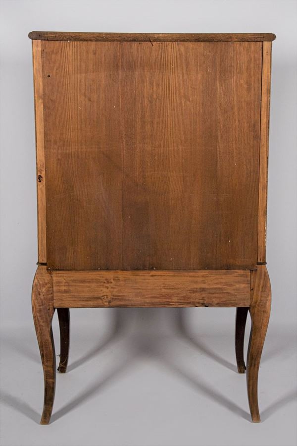 con intarsi a volute e vasi di fiori, un tiretto con calatoia sottostante. Manifattura Anni '50 - '60. Misura cm. 74,5 x 43 x 125 h.