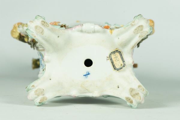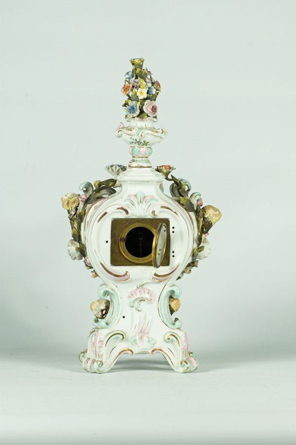 con decorazioni floreali policrome e quadrante in smalto bianco. Lievi difetti. Non funzionante. Altezza cm. 38.