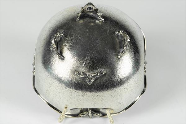 a forma tonda centinata con bordo e piedini sbalzati. Peso gr. 250. Diametro cm. 17 x 10 h.