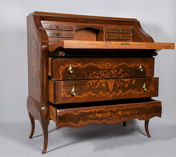 con intarsi ad intrecci floreali, calatoia formante scrittoio e due tiretti sottostanti. Misura cm. 100 x 47,5 x 108 h.