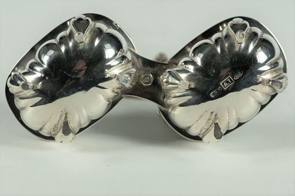 cesellata e sbalzata, piedini ricurvi e vaschette in cristallo. Misura cm. 14 x 9,5 x 9,5 h.