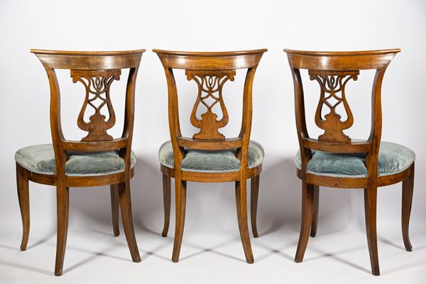 con schienali intagliati, traforati e copertura in velluto azzurro. Misura cm. 47 x 44 x 87 h.