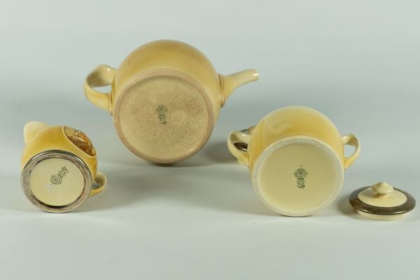 con medaglioni varipinti raff.nti "Nonnine" e guarnizioni in argento, composto da: teiera, zuccheriera e lattiera. Lieve difetto al manico della lattiera. Tot. 3 pz.