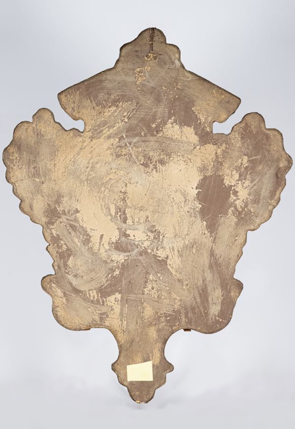 intagliato a motivi di volute e ricci, specchio al mercurio. Misura cm 57 x 78 h.