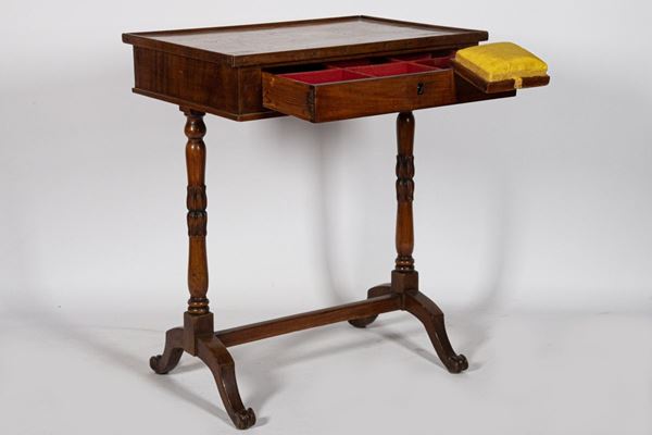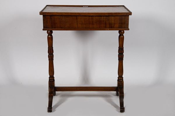 con tiretto centrale e 4 gambette ricurve che sorreggono 2 colonnine tornite. Lievi mancanze. Misura cm. 58 x 43 x 79,5 h.