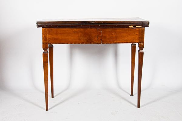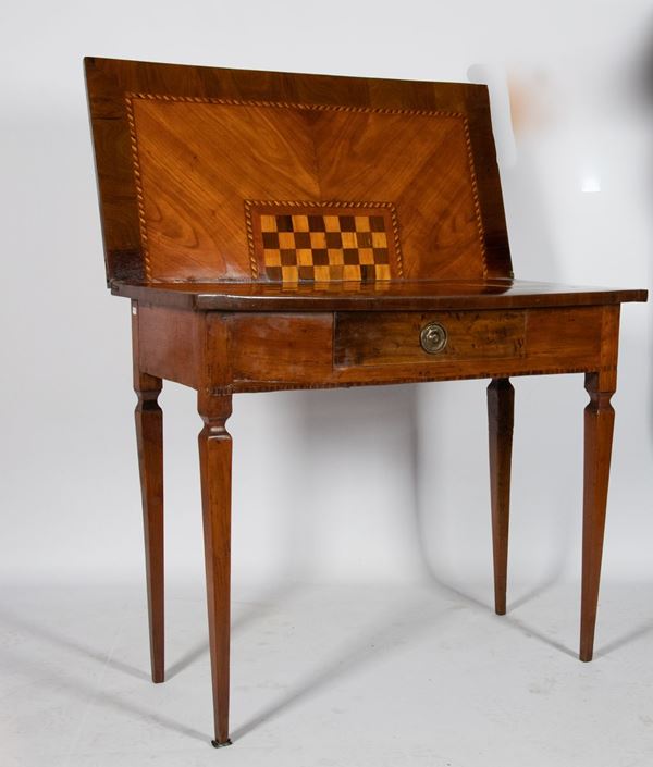 a forma rettangolare con filettature in bosso sul piano, un tiretto centrale e piano girevole ribaltabile con all'interno scacchiera intarsiata e gambe a tronco di piramide rovesciata. Misura cm. 88 x 43,5 x 76 h.