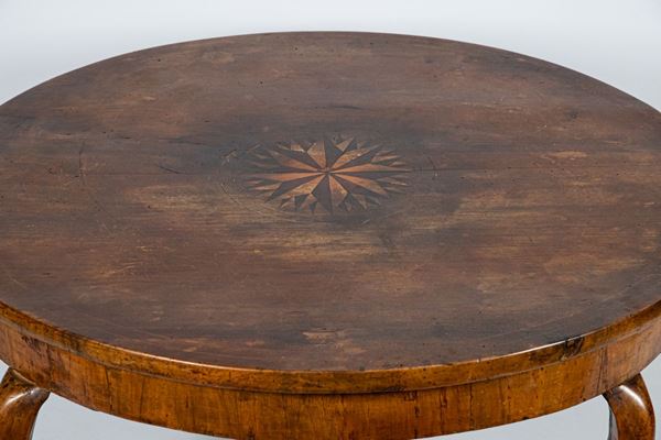 a forma tonda con intarsi a filettature e rosone centrale sul piano e gambe ricurve. Diametro cm. 112 x 53 h.