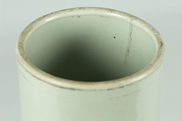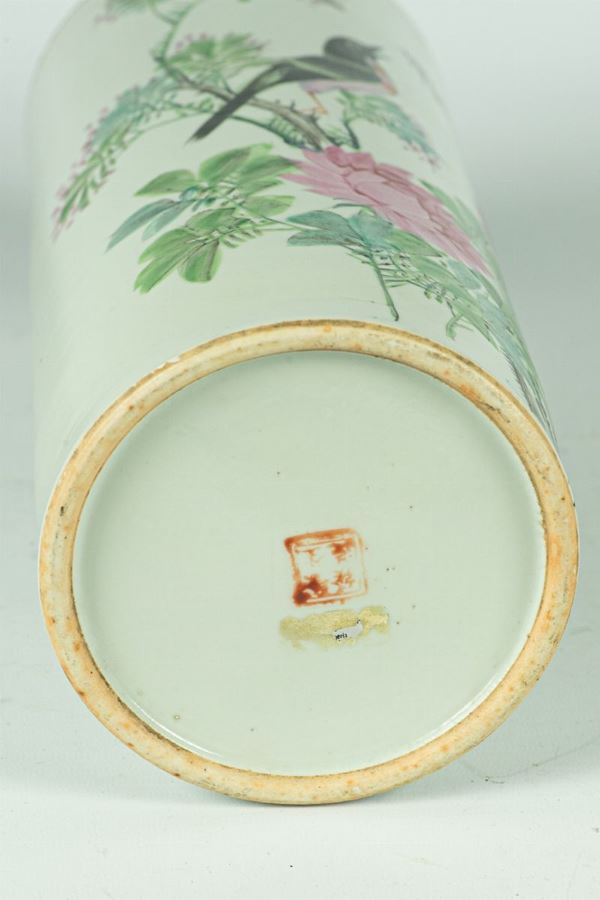 con decorazioni variopinte a motivi di fiori ed uccello orientali su fondo bianco. Difetti. Diametro cm. 12 x 27,5 h.