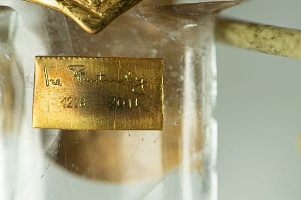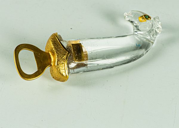Apribottiglie in cristallo di rocca, metallo dorato e pietre dure