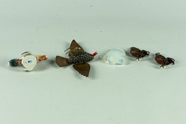 in cristallo, porcellana, smalto, ecc. "Pesce, volatile e tre galli". Misura massima cm. 13 x 8 x 4 h.