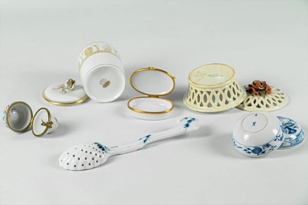 di tre scatoline, un portamarmellata, un mestolino ed un vasetto traforato. Tot. 6 pz. Misura massima cm. 20,5 x 4,5.