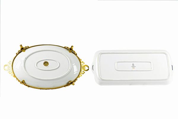 di un vassoietto ovale con ringhierina e piedini in metallo dorato ed un vassoietto rettangolare. Tot. 2 pz. Misura massima cm. 21,5 x 39 h.
