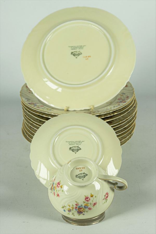 con decorazioni policrome a mazzetti di fiori, composto da: 12 tazze da tè, 11 piattini con qualche sbeccatura e 11 piattini da dolce. Tot. 34 pz.