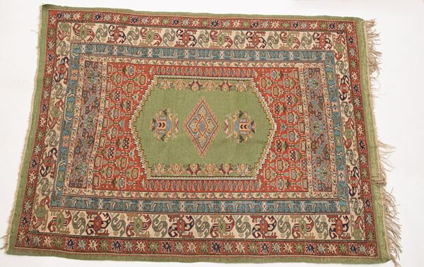 su fondo rosso, azzurro e beige. Misura cm. 200 x 152.